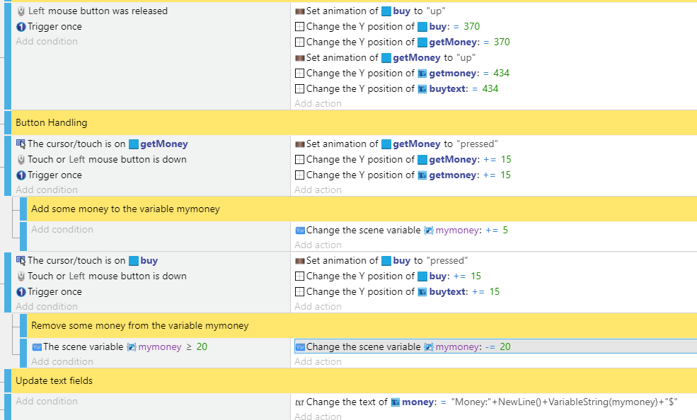 As you see, we use 2 variables in this example: one to decide how much money you win and one for how much you lose when clicking the buttons.