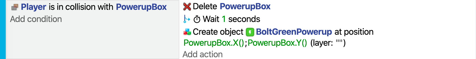 • Special actions like "Wait X seconds" can be used to wait before launching the next actions in an event. This is useful for creating cut-scenes, timelines or just effects happening not immediately.