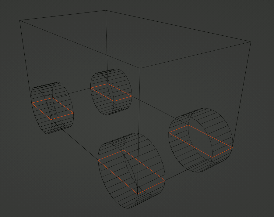 The default positions of the wheels are in the bottom corners of the car. The wheels are centered in Z axis on the bottom of the physics shape, but don't stick out on X and Y axis.
