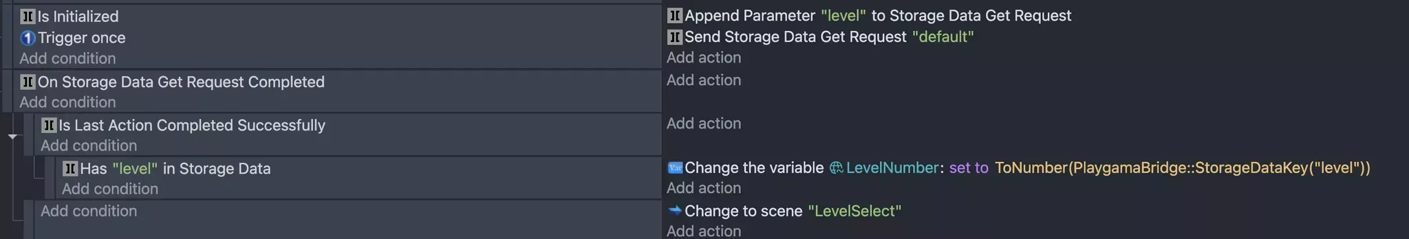 In the example above, we followed a similar approach to setting the data, but this time we used the Append Parameter to Storage Data Get Request method along with the On Storage Data Get Request Completed condition. We also checked for the existence of the level key in the response to ensure it can be assigned to our global variable, LevelNumber.