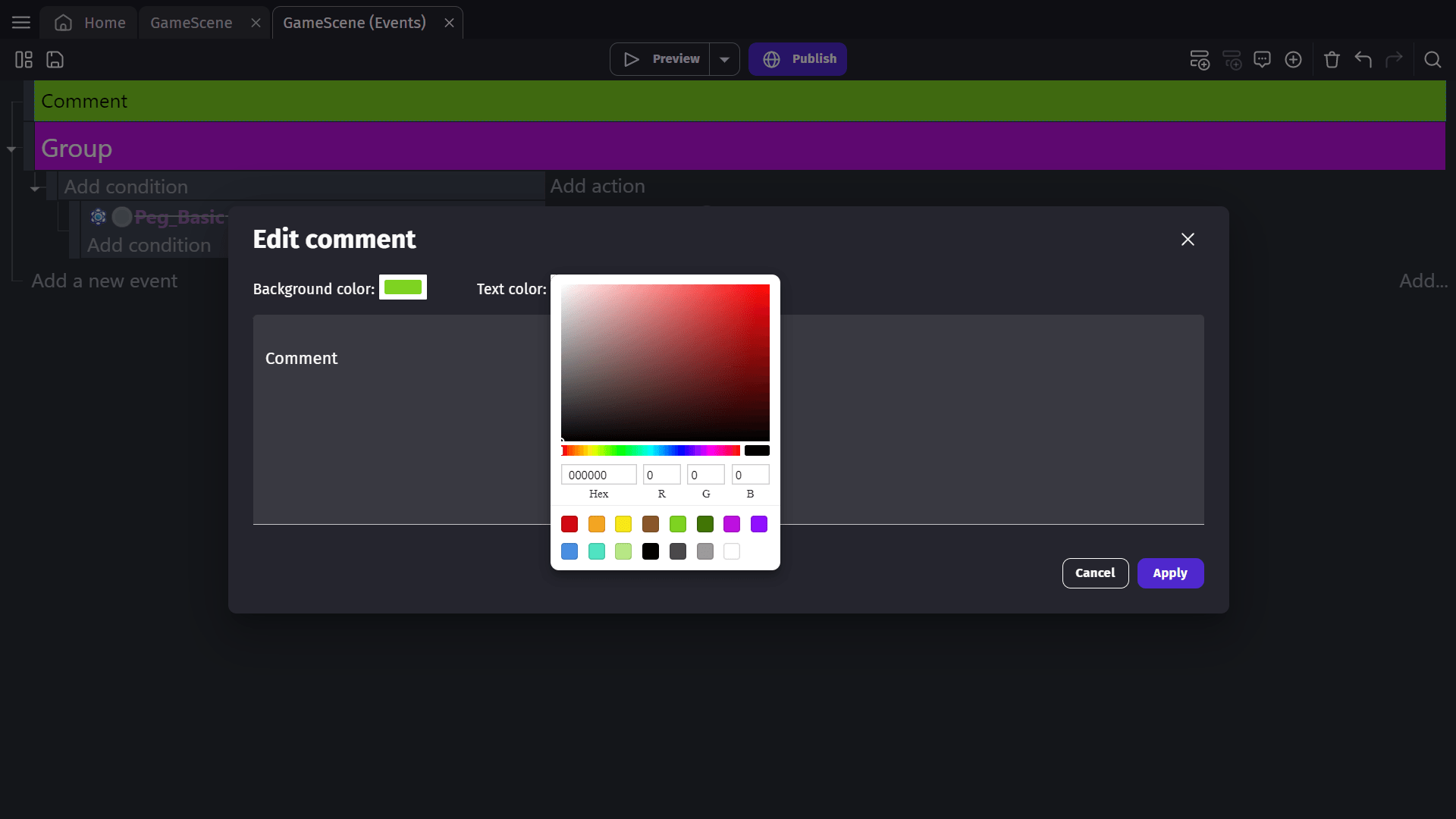 By clicking the "Add a comment" button, you can add a comment block to the list of events. Comments are useful to add explanations to complex events, or to help separate and organize your events. They can contain any text.