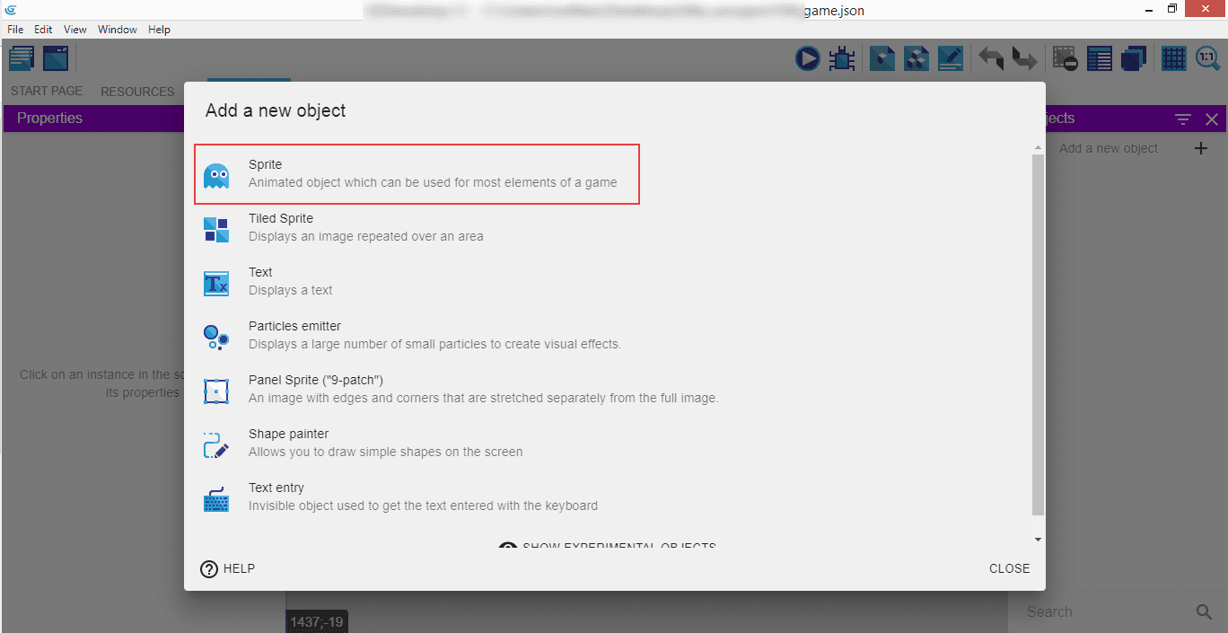 It will open a popup where a list of available options is showed. Those vary from sprites, through text, to particle emitters, shape painters, and text inputs. Select the "Sprite", which is explained as the animated object which can be used for most elements of a game.