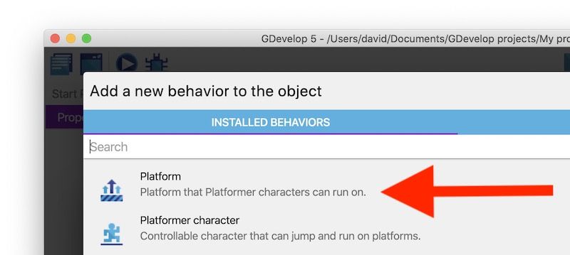 Just adding a platform to the scene isn't enough. You also need to add a behavior to the object to make it something the playable character can walk on. Conveniently, GDevelop provides a behavior named Platform behavior that does this for you.