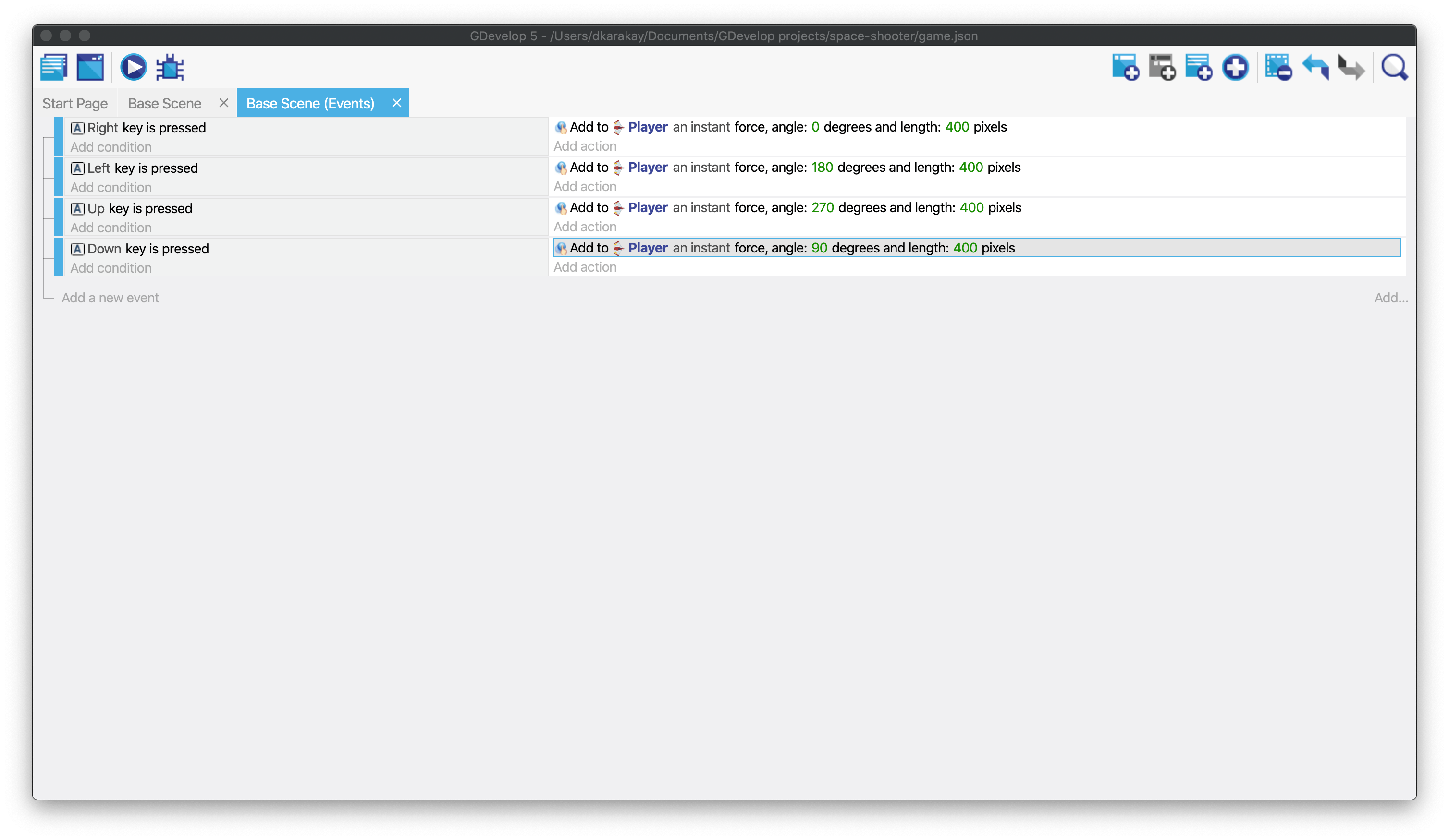 Then, click on Add Action in the same event and select Player since we want to move the Player. On the menu, select Add a force angle and enter the angle as 0, the speed as 400.