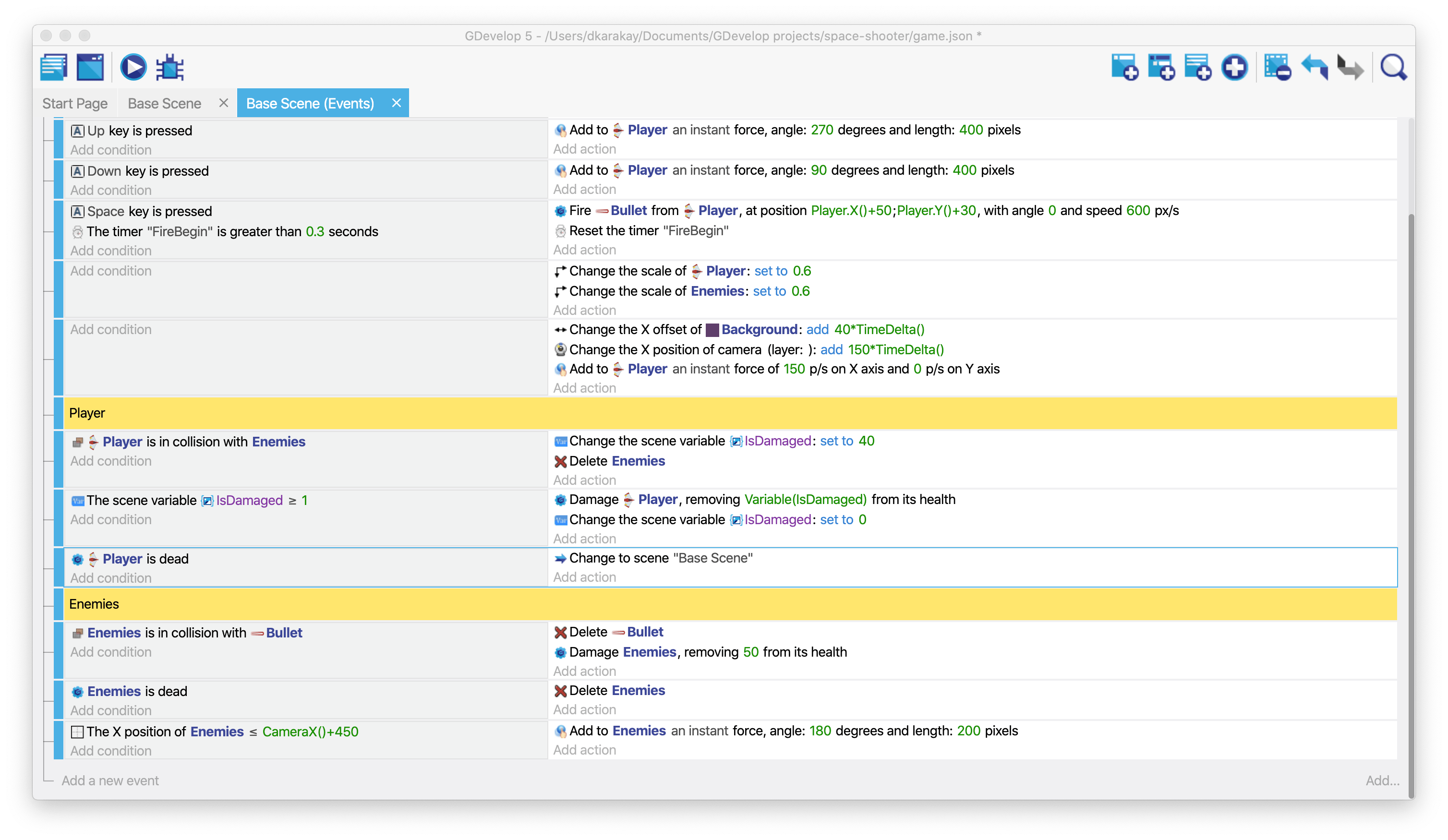We will start adding a new condition to determine the collision between the player and the enemies. Follow the same procedure in the above.